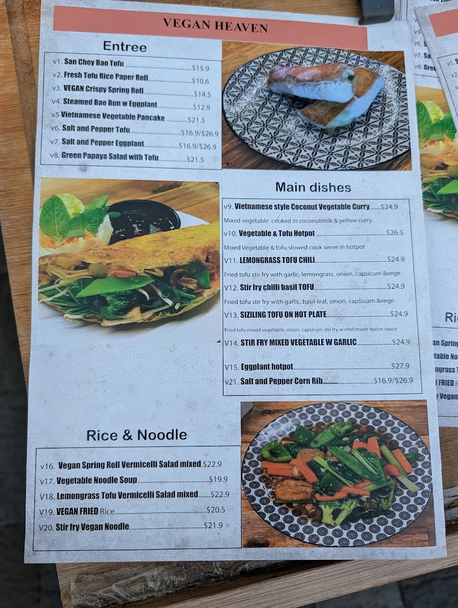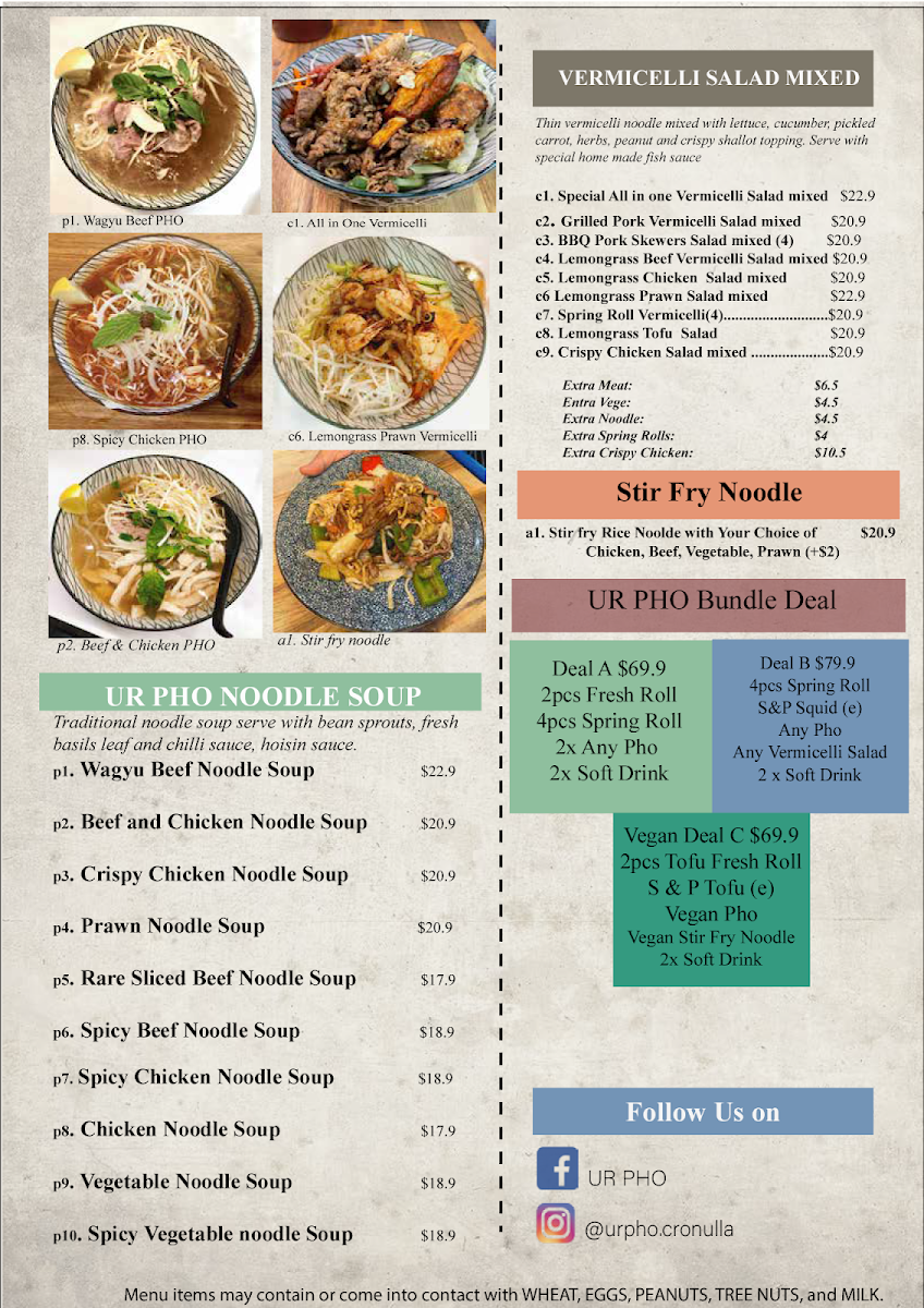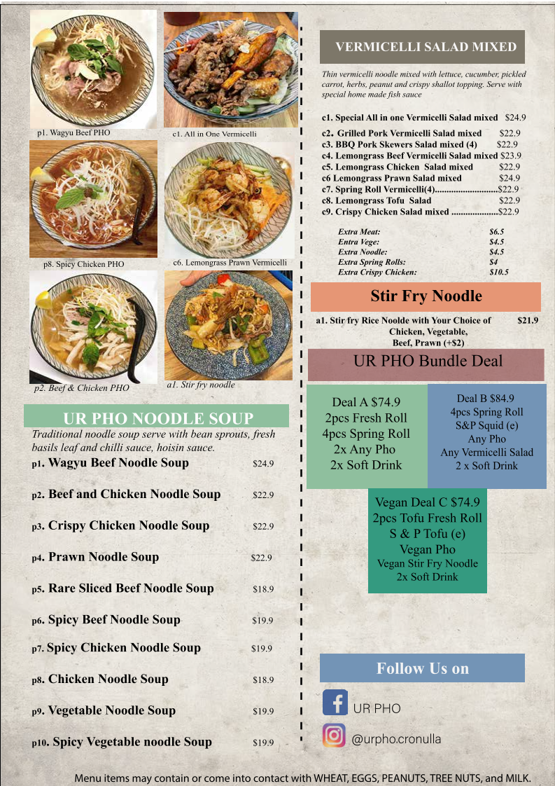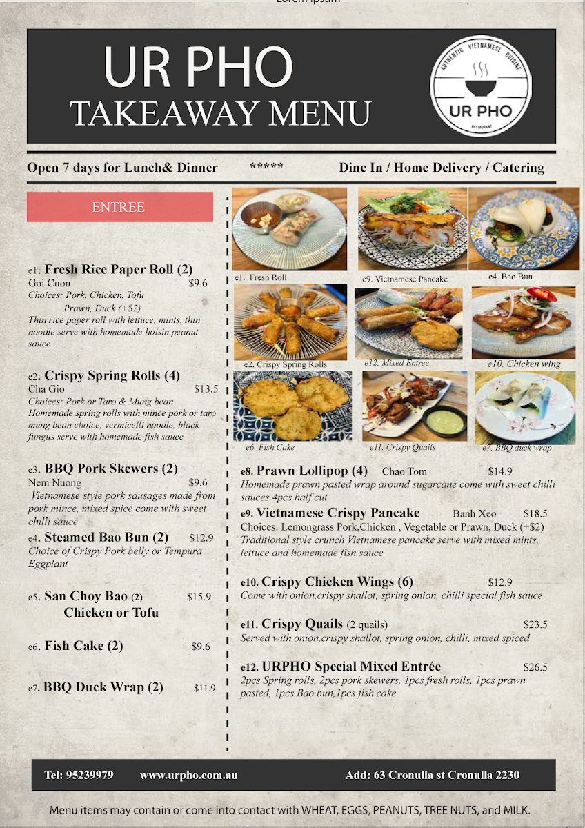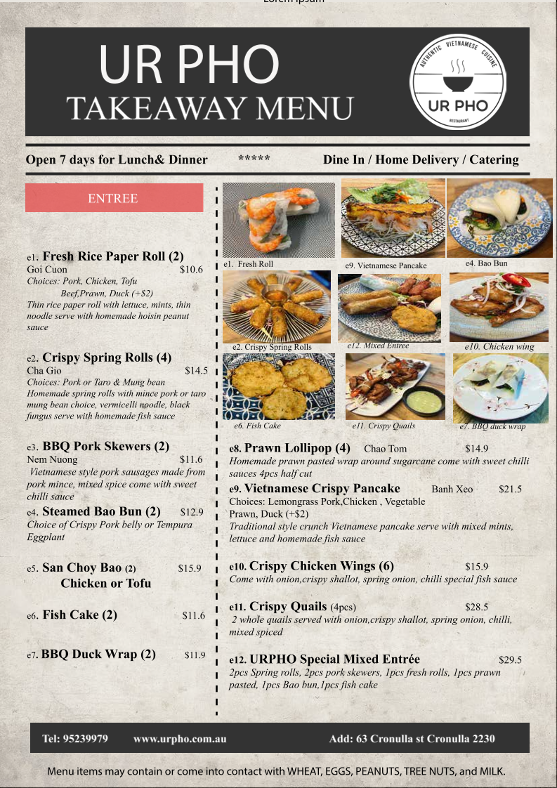 The menu at Ur Pho in Cronulla offers a wide variety of delicious and thoughtfully crafted dishes, catering to both vegan and non-vegan preferences. Starting with the entrees, the offerings include delightful options like San Choy Bao Tofu, Fresh Tofu Rice Paper Roll, and Vegan Crispy Spring Rolls. For a heartier bite, the Steamed Bao Bun with Eggplant and Vietnamese Vegetable Pancake bring a mix of textures and flavors that are sure to appeal to anyone looking for a lighter start.