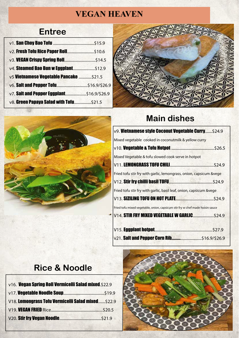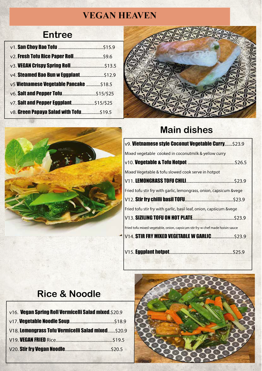 When it comes to the main dishes, the vegan-friendly selections are particularly notable. The Vietnamese Style Coconut Vegetable Curry and Vegetable & Tofu Hotpot bring the rich flavors of Vietnam to life, while the Lemongrass Tofu Chili and Stir Fry Chilli Basil Tofu offer a spicy, savory kick. The Sizzling Tofu on Hot Plate is a must-try for tofu lovers, providing a crispy, sizzling presentation that’s both satisfying and flavorful.